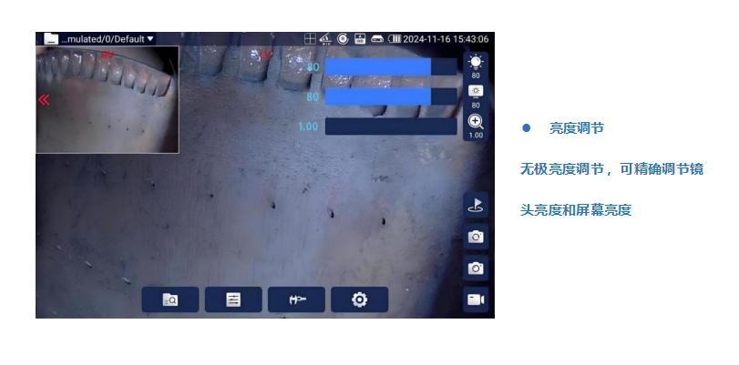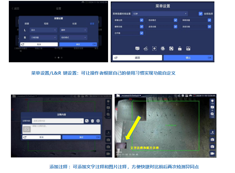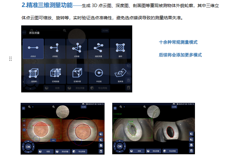 拍照、录像、光源亮度调节、屏幕亮度调节、放大缩小、画面翻转、反色、画面冻结、色彩模式调节、显示比例、网格测量、自动白平衡、图像浏览、锁定微调、菜单,支持 10 余种三维测量功能 |