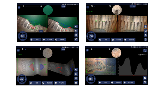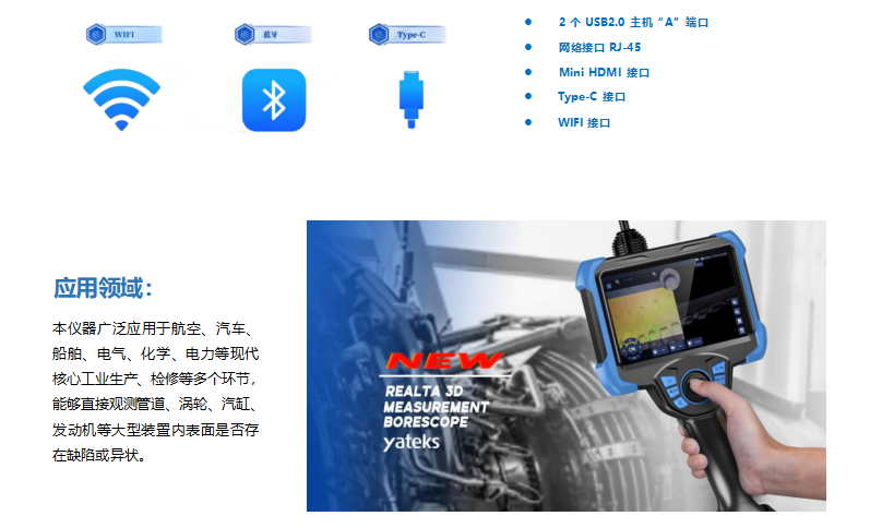 a ie 系列三维测量工业内窥镜采用 7″ips 高清液晶护眼屏,分辨率高达 1920*1200,具触摸、按键双功能,操作快速方便; 采用亚泰光电专利技术 , 自行开发图形处理器技术 ,使图像、视频响应速度更快 ,呈显画面更清晰细腻。 探头 360°全方位旋转、过载保护并自动锁定、复位 ,实现远距离图像传输 ,可以进入到更深的通道检测, 支持 6.0tops 算力,满足缺陷检测和测量的要求;丰富的外围接口,扩展性更强;集光学、精密机械、电 子机械、 电子技术和显微摄像技术一体的新型无损探伤仪器 ,用于肉眼无法触及到的内部表面缺陷检测。