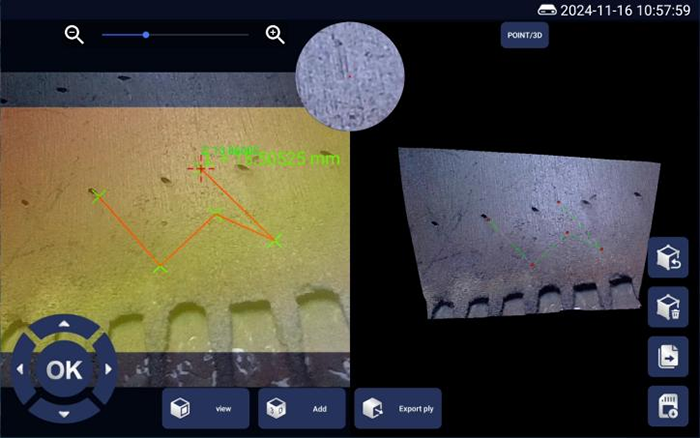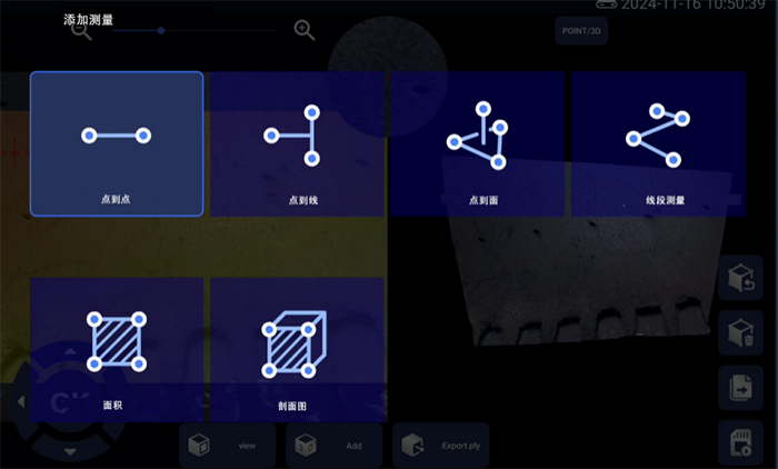 2、精准三维测量功能——生成3d点云图、深度图、剖面图等重现被测物体外貌轮廓,其中三维立体点云图可缩放、旋转等,实时验证选点准确性,避免选点错误导致的测量结果失准。