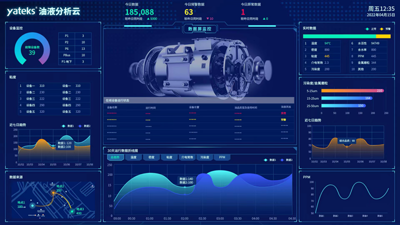 亚泰光电的油液在线监测系统集成了多种技术先进的在线油液监测传感器,实时采集油液的动力粘度、密度、温度、水分含量、金属磨粒指标等关键参数,并结合ai算法分析数据趋势,实现从“被动维修”到“主动预防”的跨越。例如:系统可精准监测320号齿轮油的健康状态,提前预警润滑系统异常,避免因渐发性故障升级导致的停机损失。