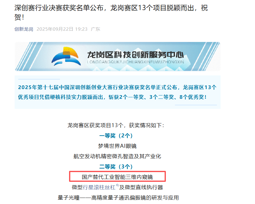 这一荣誉来之不易。就在9月22日,亚泰光电的“国产替代工业智能三维内窥镜”项目刚在深创赛中斩获亚军,顺利拿到了进军全国赛的“入场券”。此次在全国赛中再度获奖,实现了从地方到国家的技术实力认证双跨越。