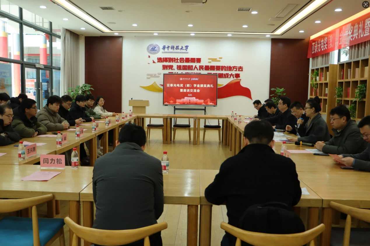 2026年3月6日上午,华中科技大学紫菘学生活动中心一楼党员活动中心内气氛热烈,2025年度亚泰光电奖教奖学金颁奖仪式暨座谈交流会在此隆重举行。本次活动由华中科技大学校友工作及对外联络办公室副主任王颖主持,学校相关单位负责人、深圳市亚泰光电技术有限公司嘉宾与获奖师生代表齐聚一堂,共同见证这一荣耀时刻。