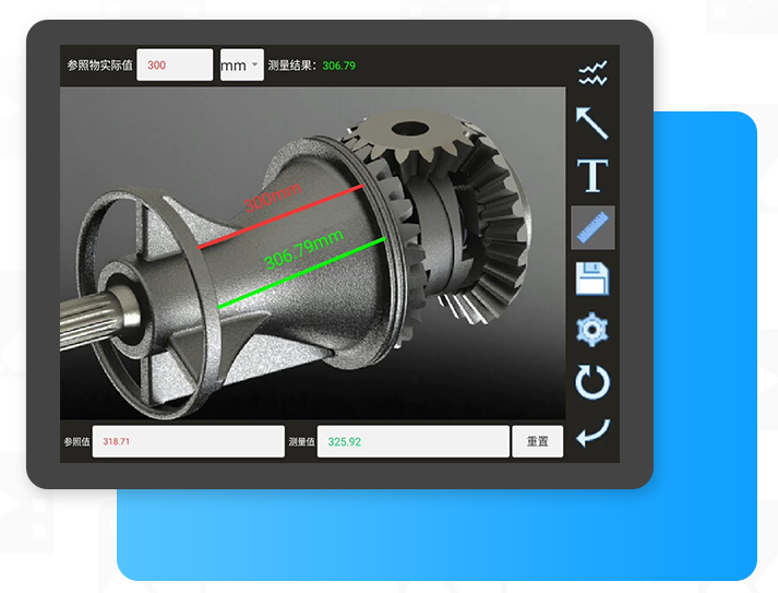 支持点到点,点到线,点到面,多线段,周长,深度, 面积等测量模式。对缺陷的分辨力优于 0.03mm,缺陷测 量结果与缺陷实际大小误差小于 5% |
